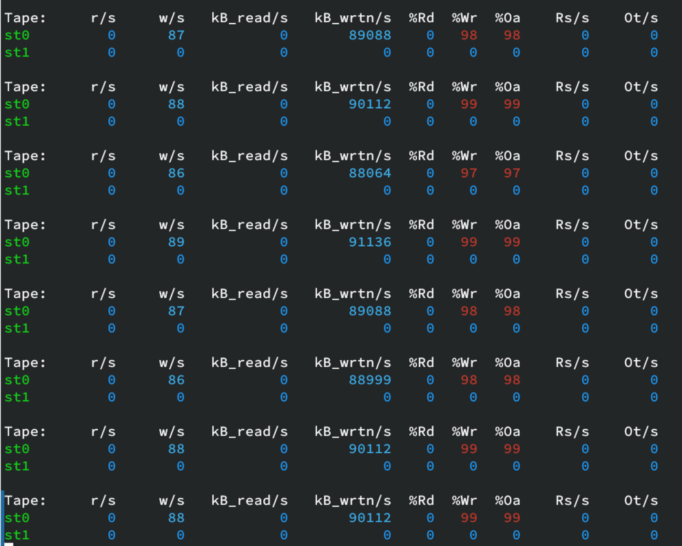 You can monitor tape drive performance during a job with tapestat 1 — the 1 is the update interval.
